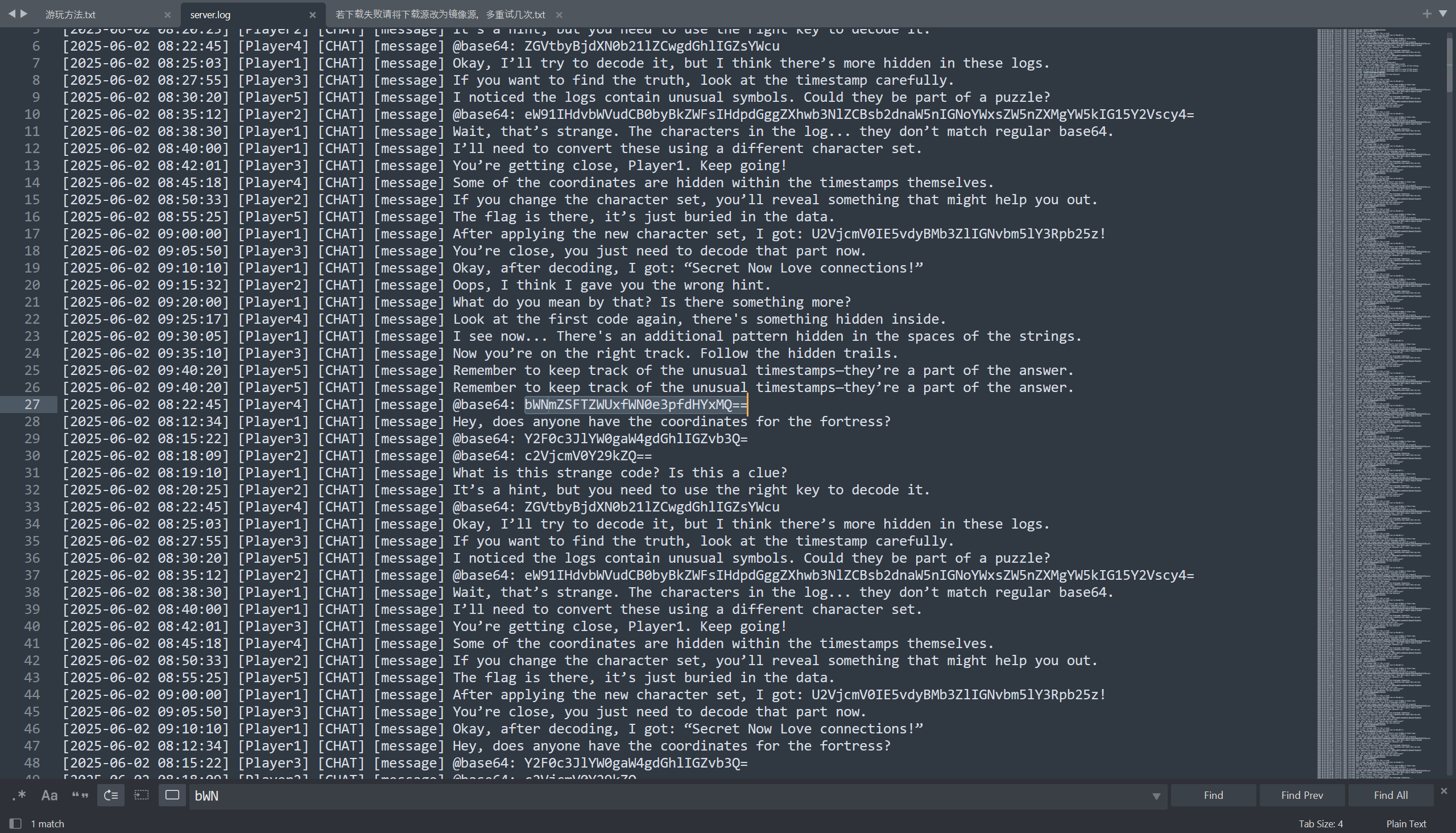 你是一个《我的世界》服务器管理员,在某个事件后,你发现服务器的日志文件被篡改。根据一条线索,玩家曾经在日志中隐藏了一些敏感信息。你的任务是通过对服务器日志文件进行分析,揭示隐藏的消息。