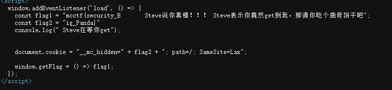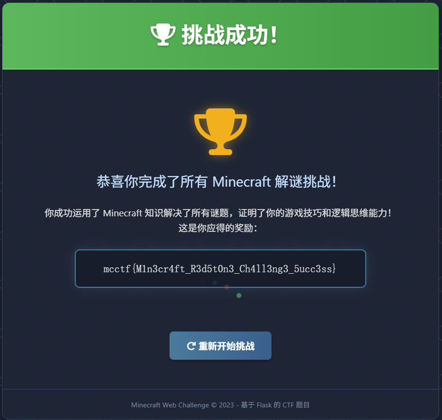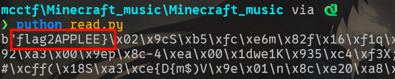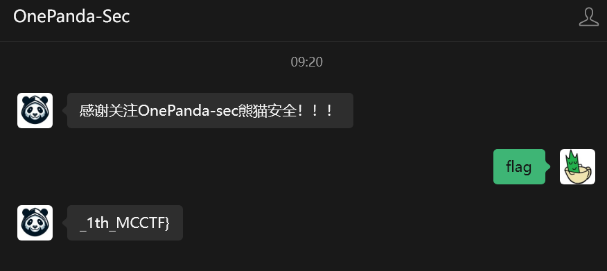 关注微信公众号“Geek极安云科”、“OnePanda-Sec”,发送flag,获取片段,并拼接存档内红石音乐歌名,其中OnePanda公众号回复的flag去掉右括号。示例:MCCTF