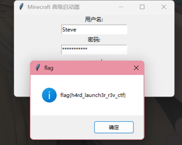 你获得了一个自制的“我的世界”启动器(Python源码/可执行文件)。据说只有输入正确的用户名和密码才能启动游戏并获得 flag。请通过逆向分析启动器,找出认证机制并获得 flag。