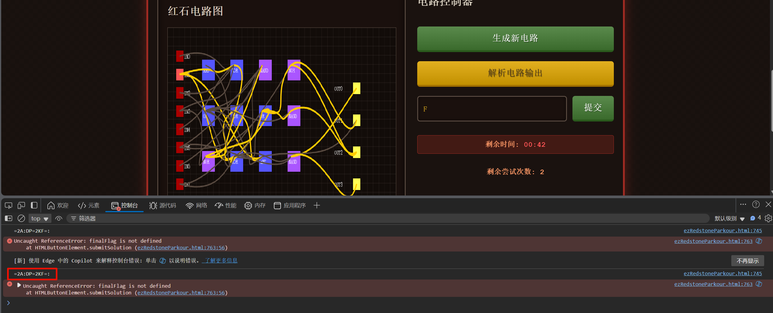 一直刷新电路,当二进制是 1 1 1 1 时对应青金石 F,控制台输出的内容就是 flag 里面的字符串。