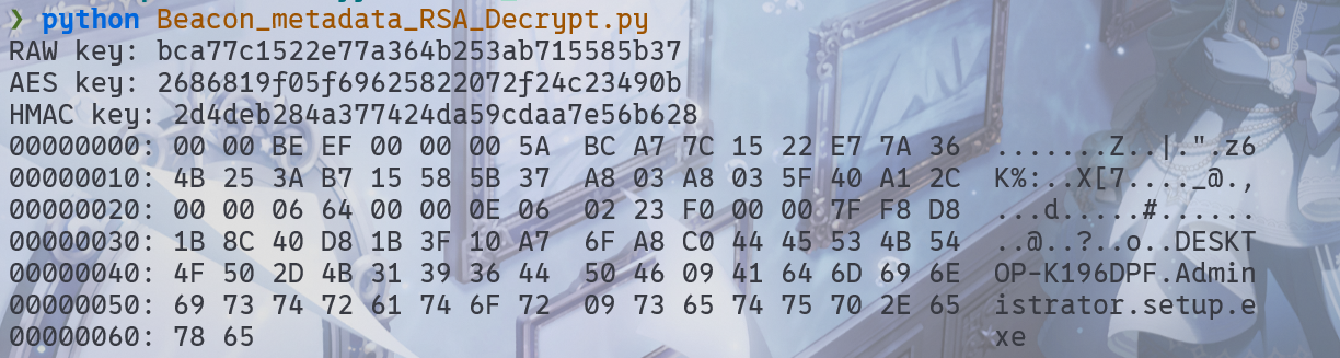 然后用脚本 Beacon_metadata_moreInfo_RSA_Decrypt.py 通过私钥解密心跳包中的 Cookie 数据,拿到 AES Key 和 HMAC Key。