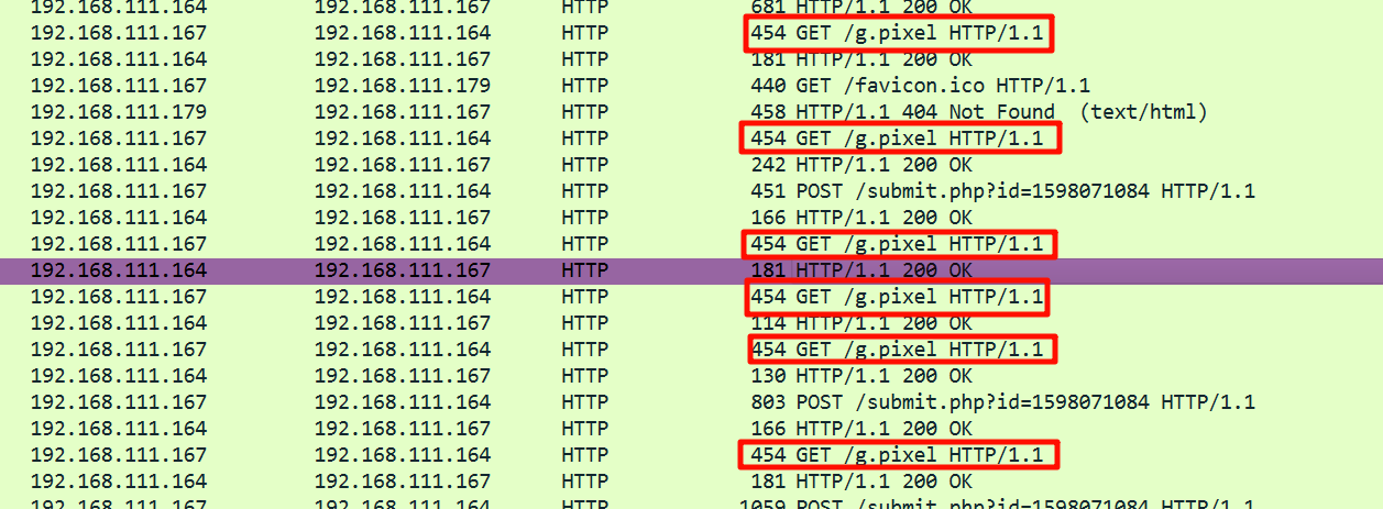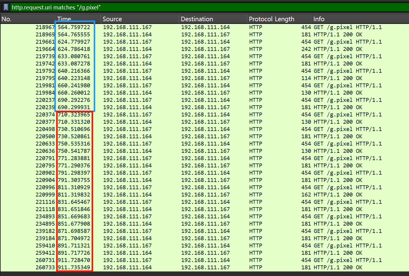 我们前面已经知道了心跳包是 g.pixel,过滤出来看看时间间隔。
