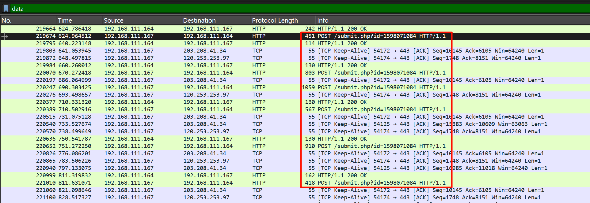 接下来解密 CS 流量,通过 data 筛选 Beacon 和 C2 之间传输的数据。